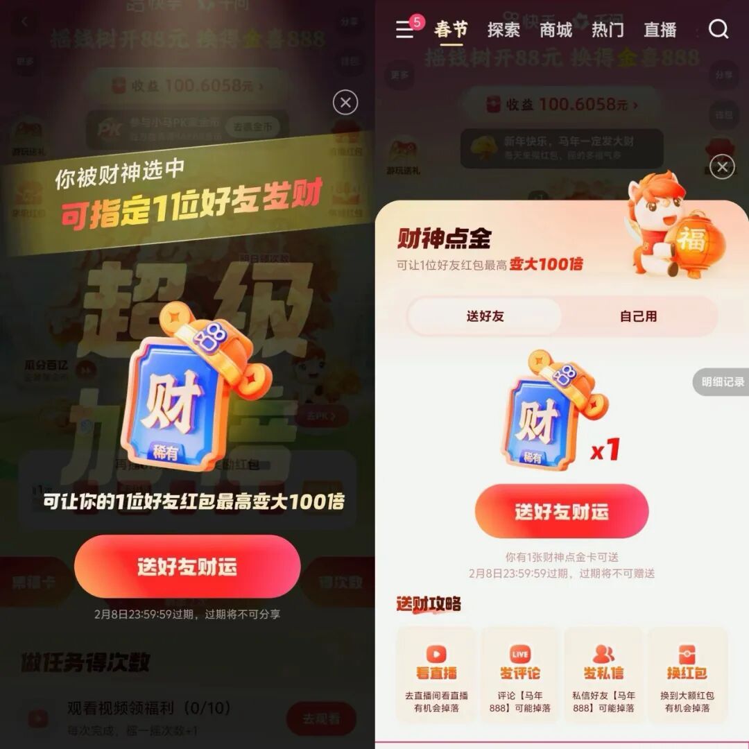 在春节这一高频情绪节点,红包天然具备“流量入口”属性。但过去几年,红包更多承担的是流量刺激功能。今年快手的变化在于,将红包嵌入社交链路之中,让福利成为关系互动的媒介。