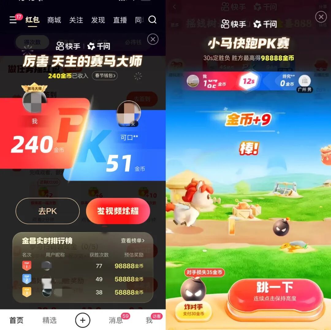 在娱乐互动方面,小游戏玩法“小马PK”则将红包激励与互动娱乐结合。用户可以进行1v1实时对战,胜方最高可赢取98888金币。春节期间,数十万用户参与“小马PK”,数十万用户参与次数超过100次。